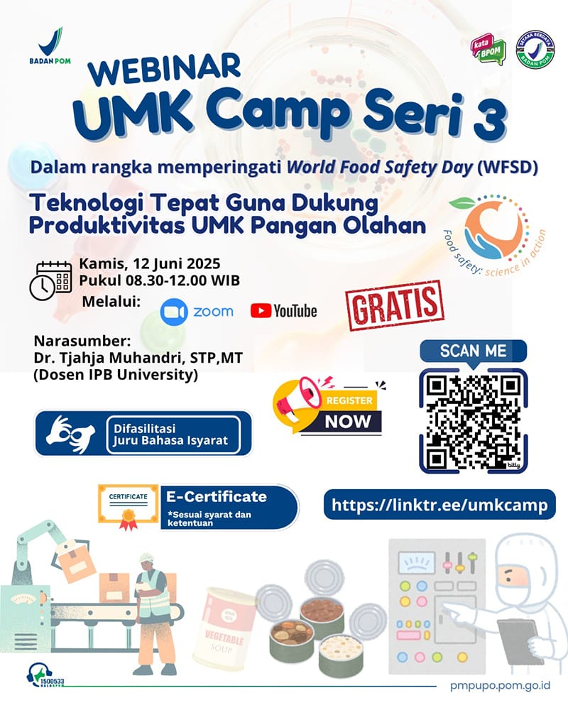 Dalam rangka memperingati World Food Safety Day (WFSD) 2025, Webinar UMK Camp Seri 3 kembali hadir!. Dengan Tema: Inovasi Teknologi Tepat Guna untuk Meningkatkan Produktivitas UMK Pangan Olahan
