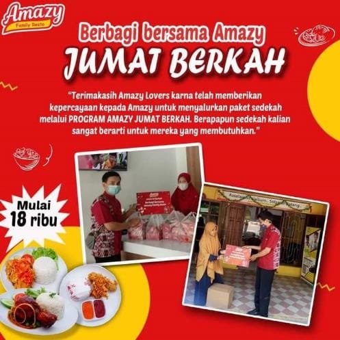 Selain itu, Amazy memiliki kegiatan rutin yaitu Jum’at berkah besama Amazy Family Resto. Setiap hari Jum’at, Amazy siap menyalurkan sedekah Amazy Lovers berupa paket menu Amazy. Paket disalurkan ke Yayasan Yatim Piatu atau kepada kaum Dhu’afa terdekat, pastinya tepat sasaran.