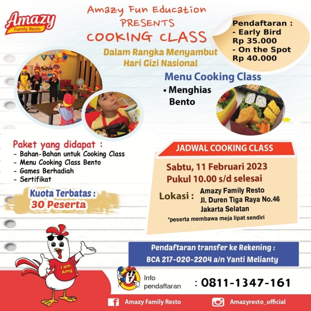 Hari Gizi Nasional diperingati setiap 25 Januari. Tahun ini, Amazy Family Resto ikut memeriahkan hari gizi dengan menggelar Cooking Class “Menghias Bento”. Jangan lewatkan event Cooking Class kali ini ya, Bunda! Ajak anak-anak untuk mengenal pola makan gizi seimbang dengan Cooking Class “Menghias Bento”.