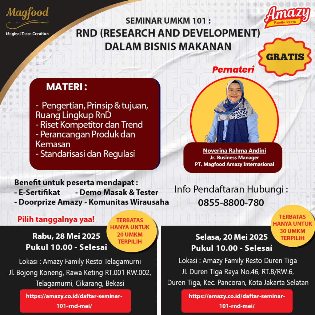 GRATIS! Peluang emas bagi para pelaku Usaha Makanan untuk belajar mengembangkan RnD dalam Produk Bisnis Makanan bersama Noverina Rahma Andini, Jr Business Manager PT Magfood Amazy Internatonal.