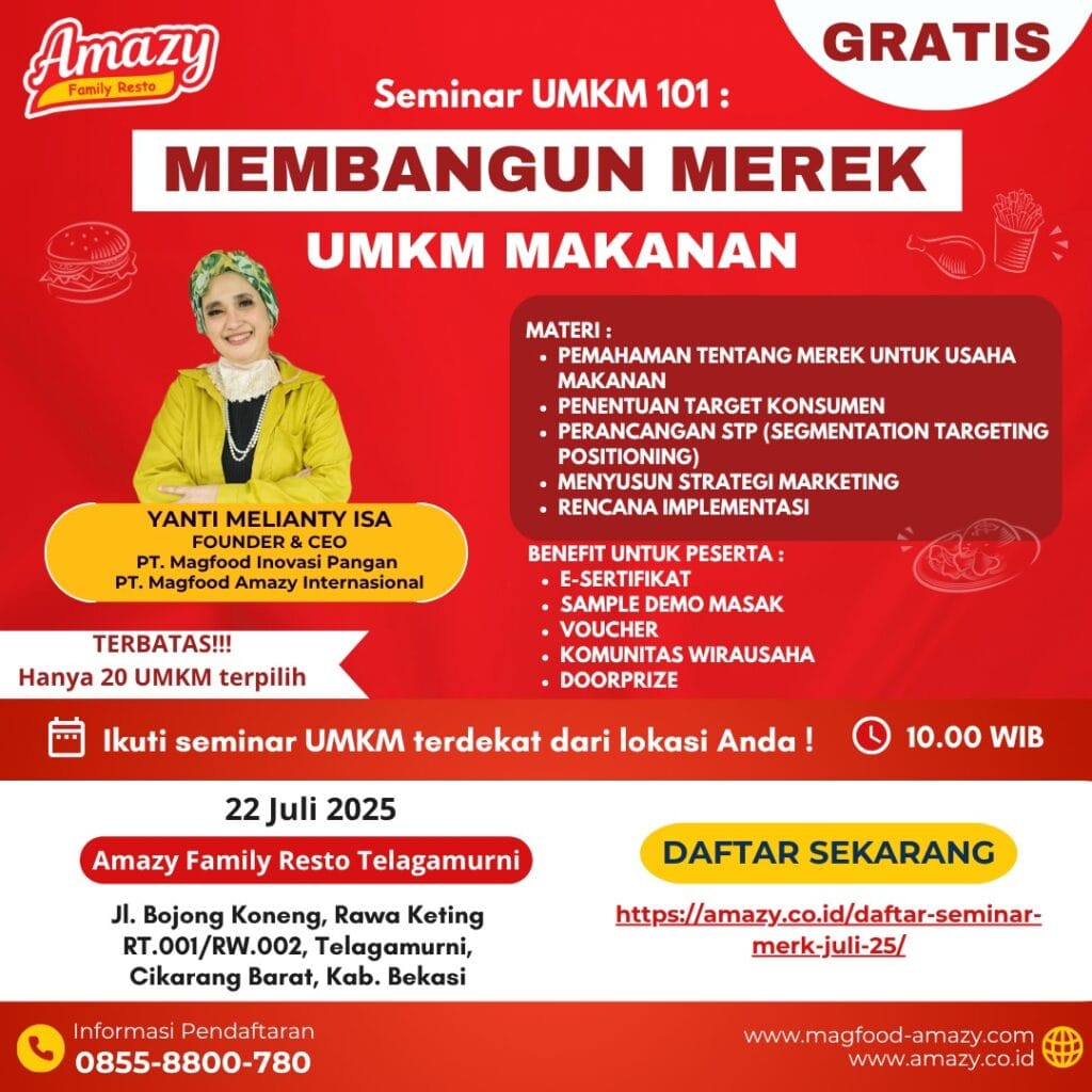 GRATIS! Peluang emas bagi para pelaku UMKM untuk belajar Membangun Merek Usaha Makanan bersama Yanti Melianty founder & CEO PT. MagFood Inovasi Pangan, PT. Magfood Amazy Internasional