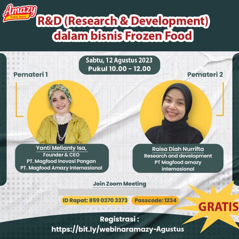 Amazy kembali sukses menggelar webinar nasional untuk UMKM bertajuk “R&D (Research & Development) dalam Bisnis Frozen Food”. Webinar ini berlangsung pada Sabtu, 12 Agustus 2023 pukul 10.00–12.00 WIB. Webinar UMKM Amazy mendapat antusias dari pelaku UMKM dari berbagai daerah di Indonesia.