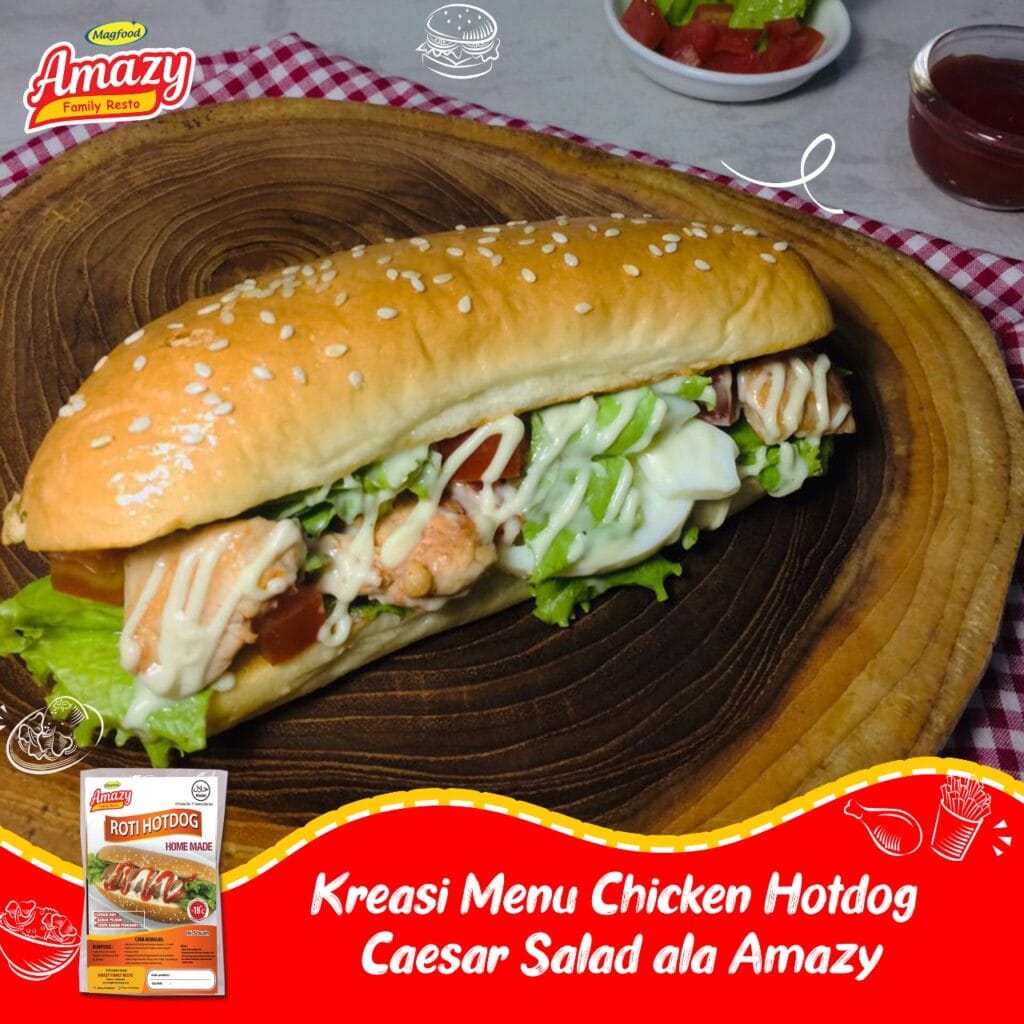 Amazy Frozen Food menyediakan banyak produk makan yang bersih, bergizi dan sehat.  Selain itu dari produk-produk frozen amazy banyak sekali kreasi makanan yang bisa kita olah menjadi makanan sehat untuk keluarga, salah satunya Chicken Hotdog Caesar Salad lho, cara membuatnya pun sangat mudah.